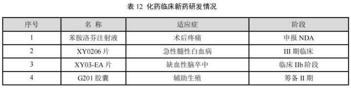 暂不计算中药研发管线,化药研发管线中确定性较高的有两个品种,一是已经申报新药上市的苯胺洛芬注射液,二是进入三期临床阶段的XY0206片。